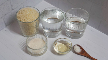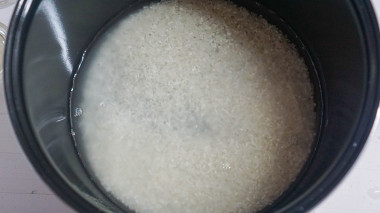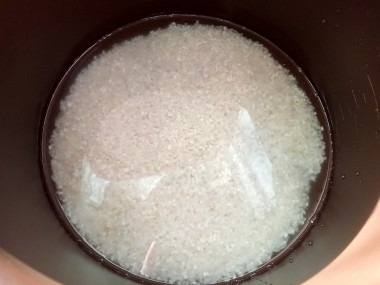 Подготовила все ингредиенты в указанных граммовках. Рис использовала круглозерый для блюд японской кухни. Хорошо его промыла под проточной водой, высыпала в чашу мультиварки, залила водой и поставила на приготовление. На моей мультиварке это режим "крупы" 25 минут. За время приготовления рис вобрал в себя всю воду, стал мягким.