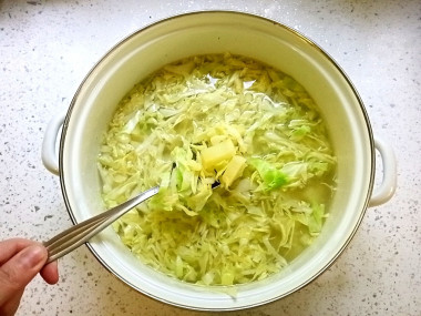 Для щей я взяла молодую капусту и молодую картошку. В кипящую воду выложила их одновременно. Если капуста зимняя жесткая, то закладываю ее первой и варю минут 15, потом картошку.