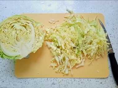 Капусту обмойте и снимите верхние листочки. Обычно они грязные и немного увядшие. Тонко нашинкуйте капусту.