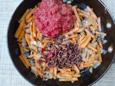 Добавьте томатную пасту. Перемешайте, обжарьте всё вместе в течение минуты и снимите с огня.