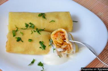 Блинчики с начинкой - любимое блюдо в нашей семье. Начинки делаю разные - такую, о которой пишете Вы, грибную (грибы с луком обжарить, немного начинки положить на серединку блинчика, сложить мешочком и завязать ниткой сыра-косички ), овощную (капуста+лук+морковь, все обжарить до золотистого цвета, блинчик с начинкой свернуть конвертиком). Еще делаю творожную начинку и целое разнообразие фруктовых - яблочную,банановую, клубничную. Приятного всем аппетита !