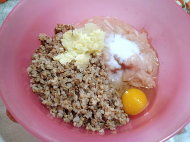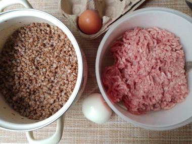 Сделала сегодня отличное блюдо которое сочетает в себе сразу мясо и гарнир! Отварная гречка у меня уже была, лук натерла на крупной тёрке, добавила яйцо, соль. Все это перемешала со свиным фаршем. Специи добавлять никакие не захотела, даже черный молотый перец.