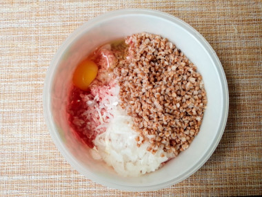 В миску положите приготовленную распаренную или отваренную гречку, мясной фарш и репчатый лук.