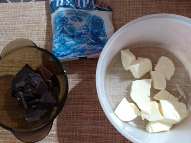 Сливочное масло достала из холодильника часа за два до начала приготовления. Когда масло стало мягким приступила к приготовлению крема. Шоколад взяла двух видов: горький и немного молочного. Растопила шоколад в микроволновке, добавила к взбитому с сахарной пудрой сливочному маслу и перемешала. Далее продолжила добавлять сахарную пудру и смешивала при этом крем миксером. Сахарной пудры для крема у меня ушло намного меньше чем заявлено в рецепте.