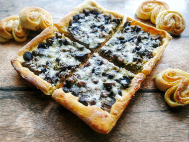 Начинку для пирога приготовила из лесных грибов - нарезала и обжарила их с луком на растительном масле. Сверху добавила немного натертого сыра.