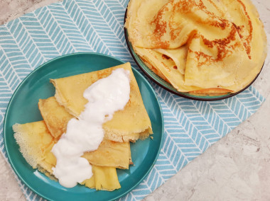 Готовые тонкие блины складывайте стопочкой, можно смазывать их сливочным маслом. Такие вкусные сладкие блины отлично идут на завтрак, их можно подать и на десерт. В качестве добавок к ним подойдут сметана, сливки, йогурт, а вот сладости будут излишними. Если уменьшить количество сахара, то блины станут универсальными. Приятного аппетита!