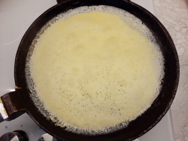 Очень важно количество яиц в этом рецепте. Не стоит его уменьшать. Яйца помогают блинам не рваться при переворачивании, какой бы толщины вы их не сделали. Чтобы в блинах не остался привкус яиц, их советуют очень хорошо взбить. У меня вкуса не осталось совсем, даже при взбивании венчиком.