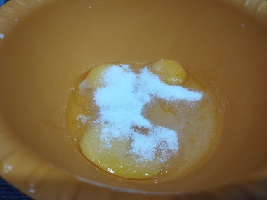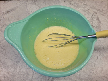 Очень хорошо взбейте яйца с сахаром и солью. Можно даже воспользоваться миксером. Я взбивала венчиком, около 2 минут.
