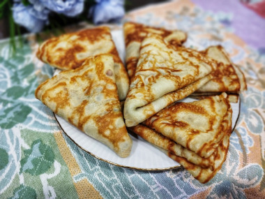 Из данного количества продуктов получилось около 10 штук блинов. Пекла я на сковороде диаметром 18 см. Блины действительно очень вкусные, сладкие, отличное десертное блюдо.