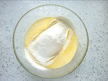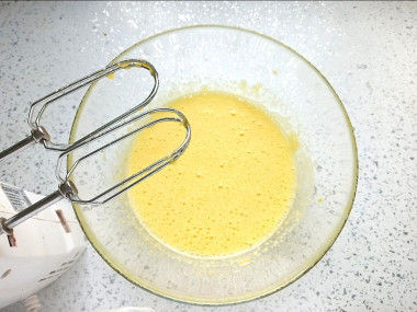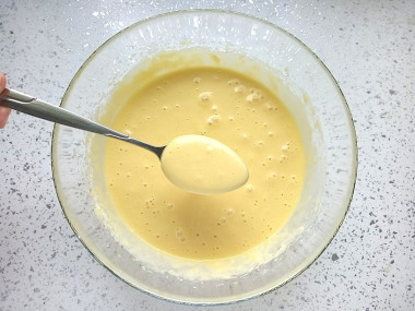 У меня в наличии были только мелкие яйца, поэтому взяла три штуки. В остальном все по рецепту. Яйца взбила с сахаром и солью, добавила молоко комнатной температуры и растительное масло без запаха. Муку и разрыхлитель просеяла, вмешала сначала ложкой, затем взбила миксером. Тесто довольно жидкое, немного похоже на бисквитное.