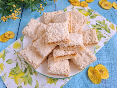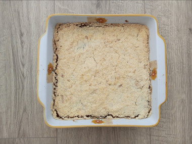 Для начинки взяла густой абрикосовый джем. Формировала пирог в стеклянной форме. Насыпала слой крошки, слегка прижала, затем слой джема. Джем предварительно нагрела в микроволновке, чтобы он стал более жидким и легко распределился по тесту. Сверху присыпала второй частью крошки. Выпекала 30 минут при 180°С. Пирогу дала полностью остыть в форме и нарезала квадратиками.