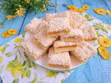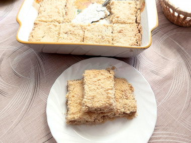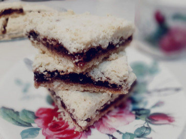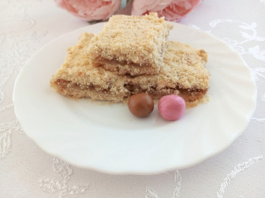 Люблю пироги, с которыми не нужно долго возиться. Быстрый пирог без яиц с вареньем к чаю как раз относится к таким пирогам. Все смешал, отправил в духовку, и через 30 минут уже можно подавать к чаю. У меня было 100 граммов маргарина, я добавила ещё 50 граммов сливочного масла, сахар, и перетерла с мукой. В это время включила духовку на 180 градусов. Варенья у меня не было, но было магазинное яблочное повидло. Его я немного разбавила кипяченой водой, доведя до такой консистенции, чтобы можно было нормально распределить по нижнему слою мучной крошки. Насыпной пирог отправила в разогретую духовку на пол часа. Через 30 минут верх пирога был еще совсем белым, поэтому оставила пирог в духовке еще на 7 минут. Пирог получился очень нежным и рассыпчатым. Мне и моим домашним понравился. Быстро и вкусно, а главное из таких ингредиентов, которые всегда есть под рукой.
