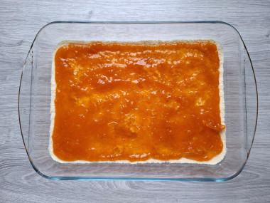 Выложите варенье, немного не доходя до края формы, чтобы можно было запечатать начинку верхним слоем теста.