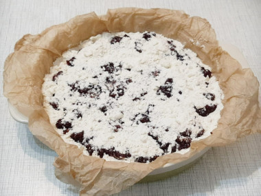 Засыпьте пирог сверху крошкой из оставшегося тестом и выпекайте при температуре 180 градусов 40-45 минут. Время приготовления в вашей духовке может отличаться, смотрите по готовности. Подробнее о духовках читайте в конце рецепта.