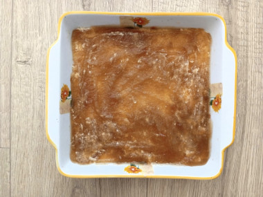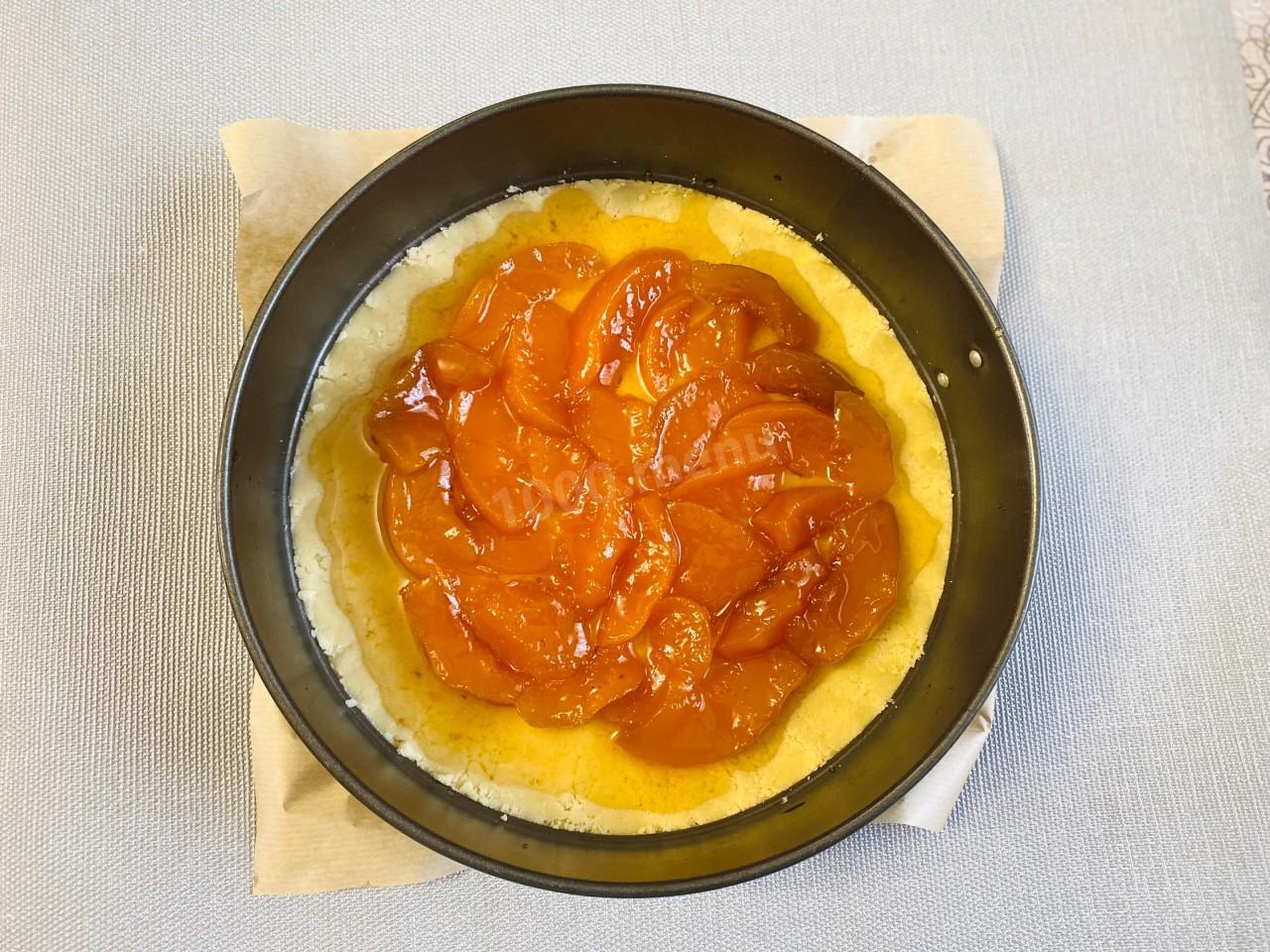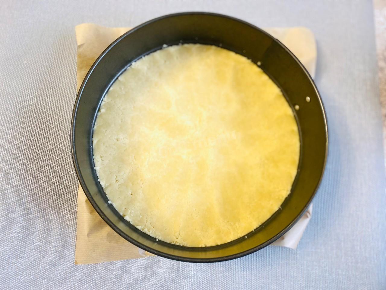 В форму, застеленную пергаментом, выложите 2/3 теста и уплотните ложкой или стаканом с плоским дном. С выбором формы и пергамента помогут статьи по ссылкам в конце рецепта.