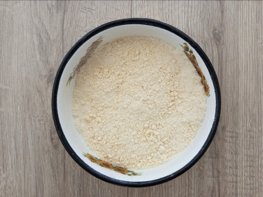 Просейте муку. Добавьте разрыхлитель и маргарин с сахаром и вымесите тесто, достаточно его просто перетереть руками. Долго не месите, иначе готовый пирог получится жестким. О нюансах работы с песочным тестом читайте в конце рецепта.