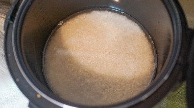 Рис всыпала в чашу мультиварки, залила чистой прохладной водой. На мультиварке включила режим "крупы", время приготовления на этой программе в моей мультиварке 25 минут.