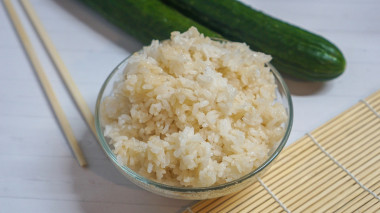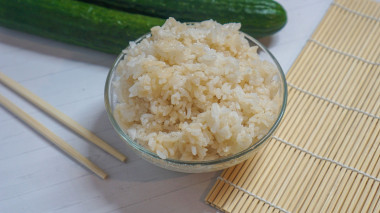 Рис тщательно промываем. Насыпаем его в чашу мультиварки, заливаем чистой водой и варим на программе «пропаренный рис» (выбираем программу в зависимости от марки мультиварки и наличия нужной). Время – 25 минут. Готовим соус –соединяем оставшиеся ингредиенты и перемешиваем до растворения сахара и соли, доводим смесь на плите до кипения. Маринад остужаем. Сваренный рис заливаем соусом и аккуратно перемешиваем, чтобы не превратить его в кашу. Все. Основа для роллов готова.