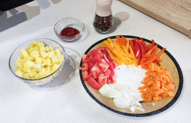 Овощи помойте и очистите. Картофель нарежьте средним кубиком, морковь и лук - полукружьями, помидоры - четвертинками, перец - соломкой.
