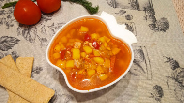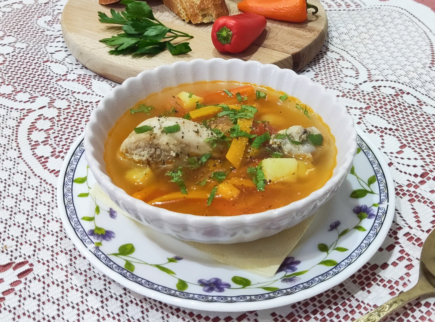 Люблю куриные супы, поэтому не раздумывая решила приготовить суп шурпа из курицы. Я взяла куриные голени и предварительно сняла с них кожу. Нарезанные овощи (кроме картофеля) обжарила на масле, вместо томатной пасты добавила кетчуп. Соединила все части супа в кастрюле и потомила на плите. Вкусное, быстрое, сытное блюдо. Благодарю за рецепт.