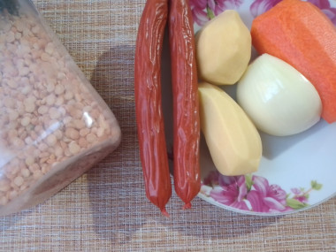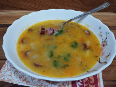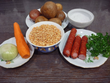 предварительно замоченный горох. Далее добавила картофель. Лук обжарила с морковью, отдельно слегка обжарила, порезанные колечками, колбаски. Добавила пережарку и колбаски ,посолила и довела суп до готовности. В конце добавила измельчённую зелень петрушки.