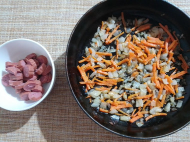 8. На сковороде без масла обжариваем нарезанные кружочками колбаски в течение 3-5 минут. После этого выкладываем кусочки колбасок в кастрюлю.