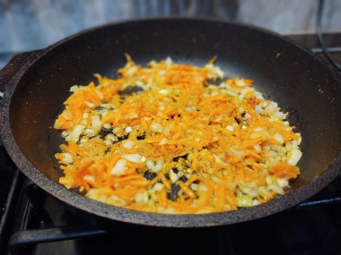 6. В это время разогреваем в сковороде растительное масло и обжариваем лук и морковь до золотого цвета.