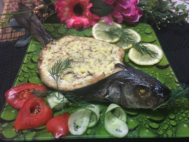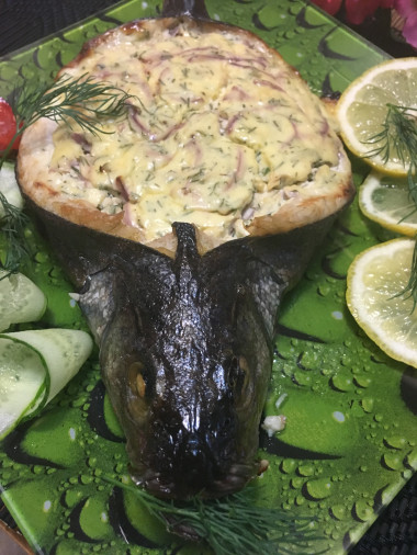 .а рецепт очень приглянулся.я решила приготовить сибаса!!!!Из рыбки я удалила все внутренности. вырезала хребет и удалила жабры....присолила и взбрызнула лимончиком.К твёрдому сыру я ещё добавила творожный сыр и полукольцами (очень тоненько) синий лучок.яйца потёрла на мелкой тёрке.из специй использовала только чёрный свежемолотый перчик.Получилась воздушная и ароматная начинка.запекала в духовке 40 минут.Получилось очень вкусно