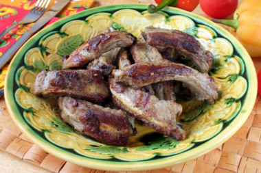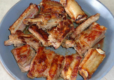Переложите готовые жареные ребрышки на блюдо и подавайте к столу в горячем виде. Дополнить мясное блюдо идеально свежими овощами. Приятного аппетита!