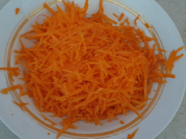 Вымойте и очистите морковь, затем натрите ее на крупной терке. Очистите чеснок от шелухи и пропустите через пресс.