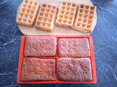Выпекайте вафли около 20-25 минут при 190°С, пока они не подрумянятся снизу. Точное время и температуру запекания определяйте по своей духовке. Готовые вафли должны легко отходить от стенок формы.