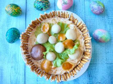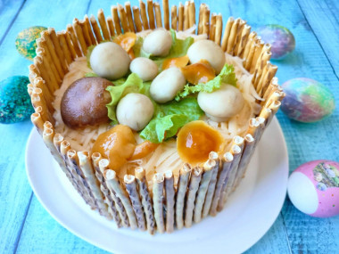 Готовить такое блюдо очень просто. Делала всё по шагам рецепта, не отступая. Для украшения взяла солёную соломку, листья салата и маринованные грибы: шампиньоны, опята. Салат получился замечательным! Очень нежным, вкусным и сытным! Украсил наш праздник!