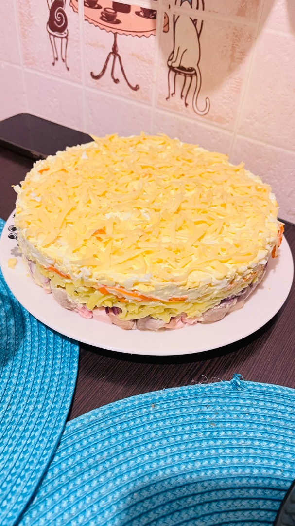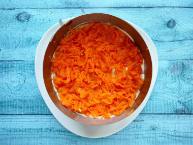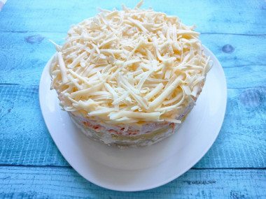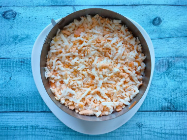 Последним слоем выложите тертый сыр. С салата аккуратно снимите кольцо. Поставьте его в холодильник на полчасика, чтобы он пропитался.