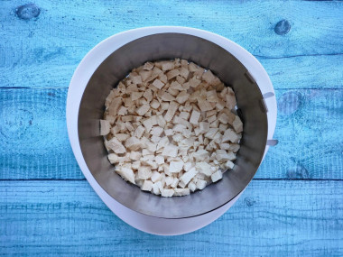Такой салат можно готовить слоями или просто смешивать все нарезанные ингредиенты. Я буду готовить салат, выкладывая слои в кольцо. Для этого поставьте кольцо сразу на тарелку для подачи. Первым слоем выложите отварное куриное мясо, нарезанное на кусочки. Этот слой и все последующие смажьте майонезом.