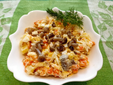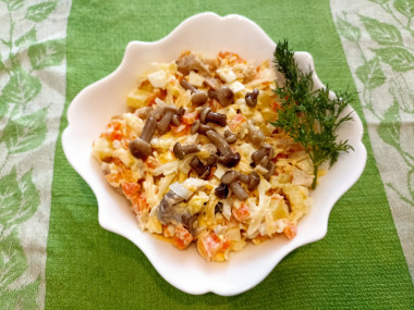 Необыкновенно вкусный салат салат с курицей и грибами классический!Нам не очень нравятся слоёные салаты, поэтому я все ингредиенты для салата нарезала кубиками, сыр натерла на тёрке и просто всё соединила в салатнике. Привычные яйца и овощи - морковь, картошка, лук в сочетании с пикантным сыром, маринованными домашними опятами и запеченым с ароматными специями куриным мясом в итоге дают неповторимый интересный вкус. Второй раз по рецепту с сайта добавляю в салат маринованные грибы и мне это всё больше и больше нравится. Свежей нотки добавил укроп. Большое спасибо автору рецепта, готовьте с удовольствием!