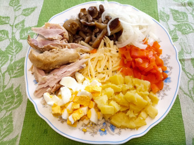 Как сделать классический салат с курицей и грибами? Подготовьте для этого все необходимые ингредиенты. Картофель и морковь хорошо промойте в проточной воде от загрязнений, а затем отварите в кипящей воде в течение 20-25 минут, до мягкого состояния. С готовых овощей слейте горячую воду и оставьте их остывать. Так же, заранее отварите куриное мясо в кипящей воде, в течение 30 минут, а яйца 7-8 минут. Все полностью остудите.