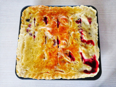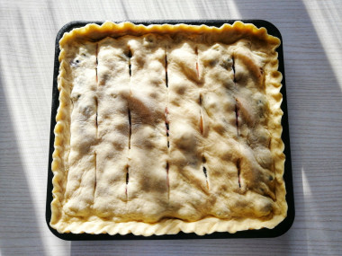 Закрыв начинку пластом теста, сделала на нём надрезы, как было посоветовано в рецепте. Верх пирога смазала взбитым яйцом.