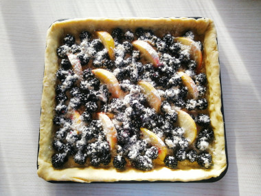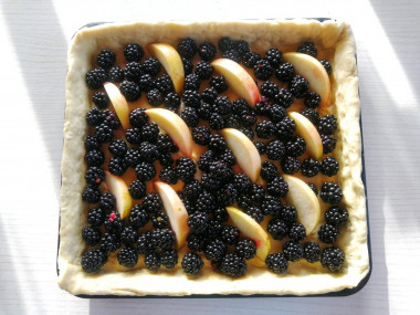 Выложив ежевику и яблоко на тесто, присыпала их сахаром и мукой, которую взяла вместо крахмала.