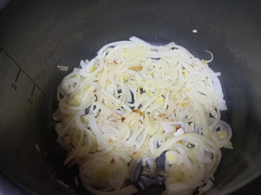 В чашу мультиварки влейте немного растительного масла. Установите режим "Жарка" и дождитесь когда масло нагреется. Отправьте лук в чашу.