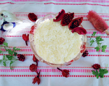 Сверху посыпаем натертыми на терке яичными белками. Можно украсить зеленью, но лучше салат ничем не украшать, оставить просто белым, ведь не зря он называется «Невеста».