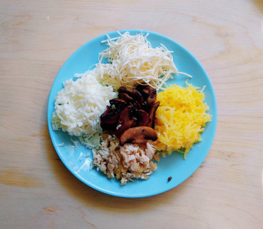 Захотелось вкусного салатика, а на салат "Невеста" уже давно поглядываю. Состав вкусненький) Все продукты натирала на средней терке, чтобы было более воздушно. По поводу яиц: Мне понадобились вареные желтки для другого рецепта, поэтому я решила заменить два яйца на пять белков, тем более здесь белый цвет в тему) Маринованных грибов у меня не нашлось, зато были свежие шампиньоны, я их нарезала пластинками и поджарила на растительном масле. Лук мне не захотелось добавлять в столь нежный салат) Майонез заменила на термостатную сметану, смешанную с горчицей и солью, вполне похоже получилось. Все прослоила и получился отличный салат! Кстати, сметана не потекла даже через несколько часов. Все ингредиенты прекрасно сочетаются, очень вкусно получилось. Теперь буду готовить такой салат на праздники.