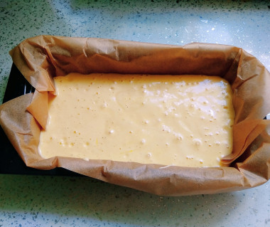 Перелейте однородное тесто в форму для запекания, смазанную маслом. Если печете в силиконовой форме, ее ничем смазывать не нужно. Я использовала пергамент для выпечки.