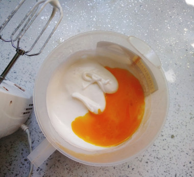 В белковую массу введите сырые желтки. Взбейте миксером, чтобы они смешались с другими продуктами.