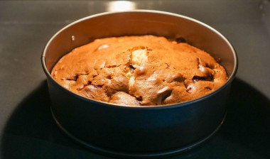 Для выпечки я беру разъёмную форму ( 18 см). Дно застелите пергаментом, а бока смажьте маслом. Готовое тесто выложите в форму и равномерно распределите его по всей форме. Поставьте пирог в духовку, предварительно разогретую до 180 градусов, на 40-50 минут.