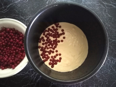 Яйца с сахарным песком взбивала миксером до пышности минут 10. Добавила молоко, чуть подогрев, и масло без запаха. Взбила. Потом просеяла в тесто муку и разрыхлитель. Но не взбивала миксером, чтоб не потерять воздушность теста, а перемешала силиконовой лопаткой аккуратными движениями сверху вниз. Выложила в чашу мультиварки слоями ягоды красной смородины и тесто, но при выпечке ягодки всё равно опустились на дно. Готовила я в мультиварке, так как духовка моя была занята, в режиме "выпечка" 40 минут. Готовую шарлотку перевернула дном вверх на блюдо, чтоб ягодки были сверху) украсила свежей красной смородиной.