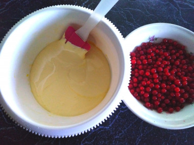 В готовое тесто выложите замороженные ягоды и аккуратно вмешайте их. Удобно это делать лопаткой или ложкой, чтобы ягоды сильно не мялись не пускали сок.