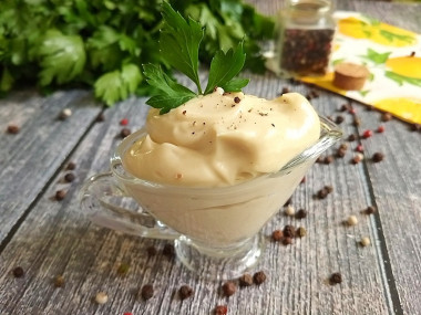Взбивала соус буквально минуту, он моментально уплотнился и посветлел. Из-за присутствия горчицы цвет получился немного бежевый. Майонез очень густой! Если нужно более жидкий, советую взять чуть меньше масла.