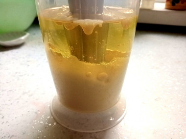 Включите миксер и начните взбивать продукты. Практически сразу смесь станет густеть и белеть. Когда это произойдет, начните двигать насадку вверх и вниз, захватывая все слои соуса. Если он будет получаться чересчур густым, то влейте еще немного масла. Мне этого не потребовалось.