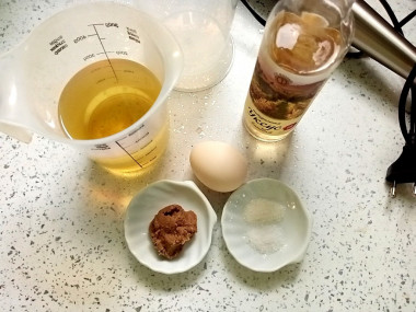 Готовится такой майонез при помощи погружного блендера. Возьмите стакан, который идет к нему в комплекте. Выложите туда горчицу, всыпьте соль, сахар, влейте уксус. Вбейте яйцо. Обязательно мойте яйца перед использованием, так как даже на кажущейся чистой скорлупе могут находиться вредные бактерии. Лучше всего использовать моющие средства для пищевых продуктов и щетку. Влейте сразу все растительное масло.