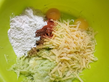 В миску с натертыми кабачками добавьте сыр, зелень и вбейте куриное яйцо. Добавьте соль и черный молотый перец по вкусу. Тщательно перемешайте ингредиенты, чтобы масса стала однородной. Она получится немного жидкой, пусть вас это не пугает, мука исправит ситуацию.